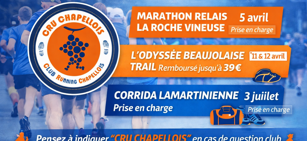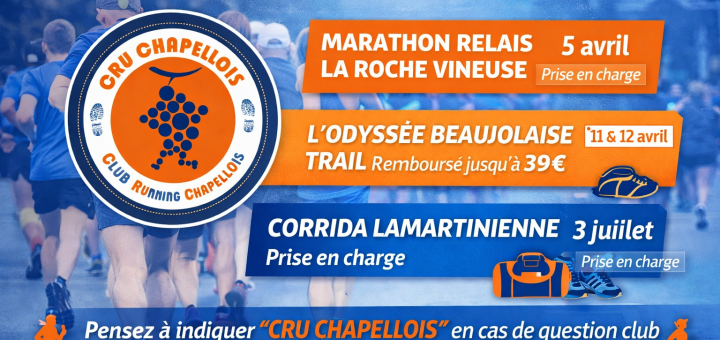 Le CRU soutiendra vos participations à 3 courses cette saison ! En plus du Marathon Relais de La Roche Vineuse, déjà annoncé, le CRU Chapellois a décidé de soutenir financièrement deux autres événements cette...