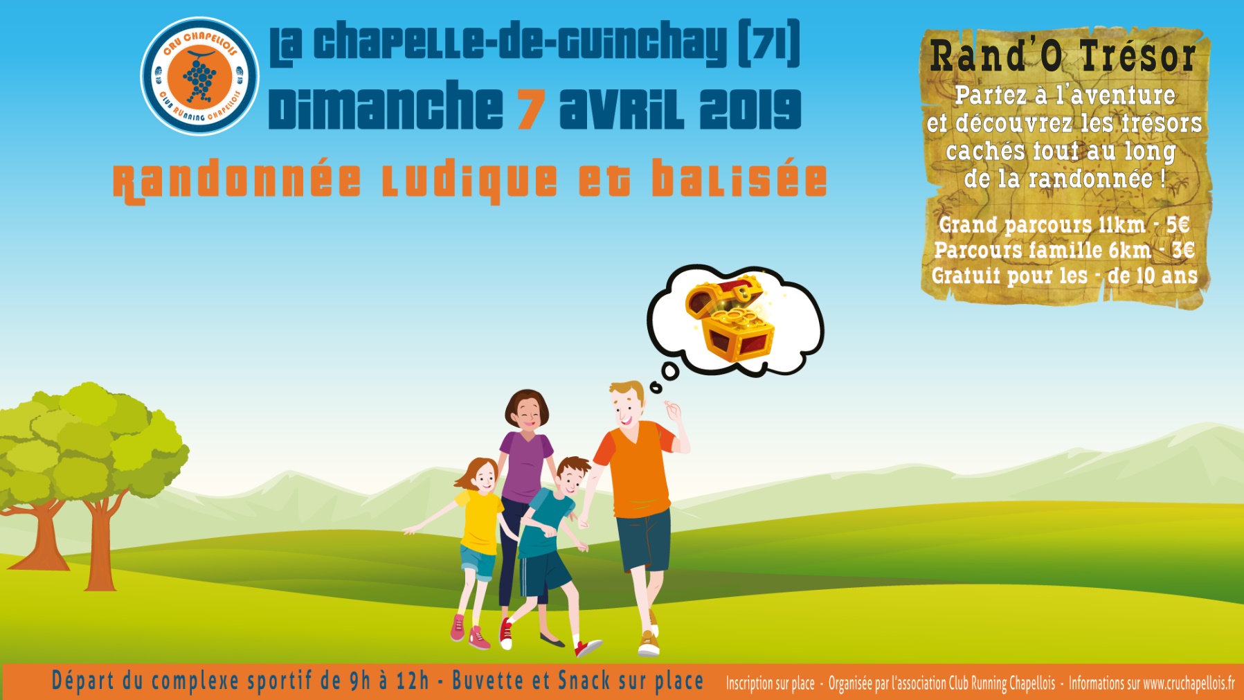 Le CRU chapellois organise la 1ère édition de sa Rand’O Trésor, une randonnée ludique et balisée à la recherche des trésors du Beaujolais ! Elle aura lieu le dimanche 7 avril 2019 au départ du complexe sportif de la Chapelle-de-Guinchay.