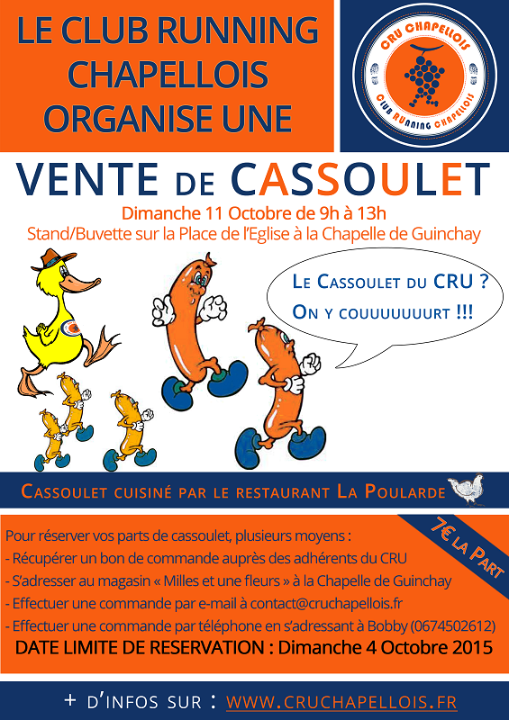 Cette vente de cassoulet est la première manifestation officielle du CRU chapellois et a pour but de nous aider à financer le tout premier événement sportif organisé par le CRU, prévu pour la mi-Mars 2016 !
