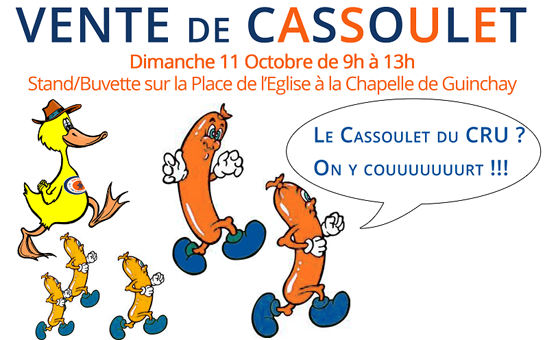 Le CRU chapellois organise une vente de cassoulet le Dimanche 11 Octobre 2015. Un stand présent sur la place de l’église de la Chapelle de Guinchay, de 9h à 13h, permettra de venir récupérer les barquettes de cassoulet qui auront été commandées jusqu’à la date limite du Dimanche 4 Octobre 2015.