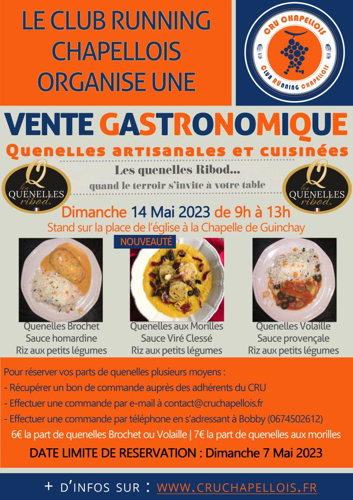 Le CRU chapellois organise une nouvelle vente gastronomique le Dimanche 14 Mai 2023. On ne change pas une recette qui fonctionne et que vous semblez apprécier donc cette année encore ce sera une vente de quenelles gastronomiques RIBOD, élaborées à Mâcon !